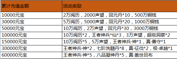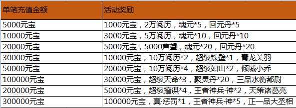 活动内容:活动期间,游戏内充值活动,玩家单笔充值一定金额,即可获得相应的充值奖励。(单笔充值奖励只计算充值元宝最大值,可以单笔重复充值重复领取)